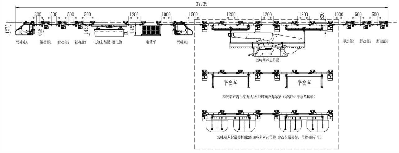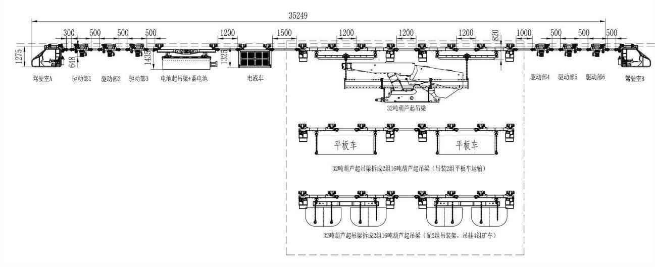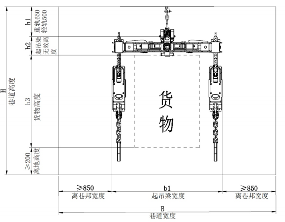 方式一:起吊梁位于中間位置,適用于巷道空間充足的運(yùn)輸情況,司機(jī)開(kāi)車時(shí)視野開(kāi)闊,采用葫蘆起吊梁,也可拆解為小噸位起吊梁,用于運(yùn)輸平板車、礦車等小型貨物。