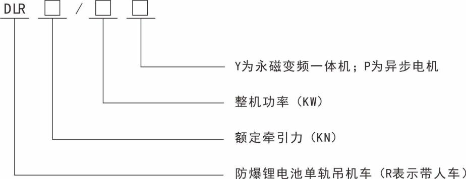 示列:型號DLR392/168Y表示額定牽引力392KN,驅動電機整機總功率168KW的鋰電池單軌吊機車。