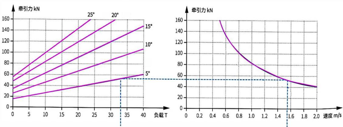 例如:DLR168/72Y單軌吊負載33T,在爬坡時速度為1.54m/s
