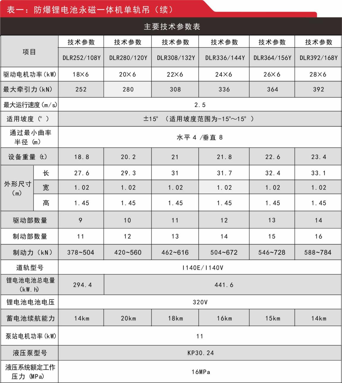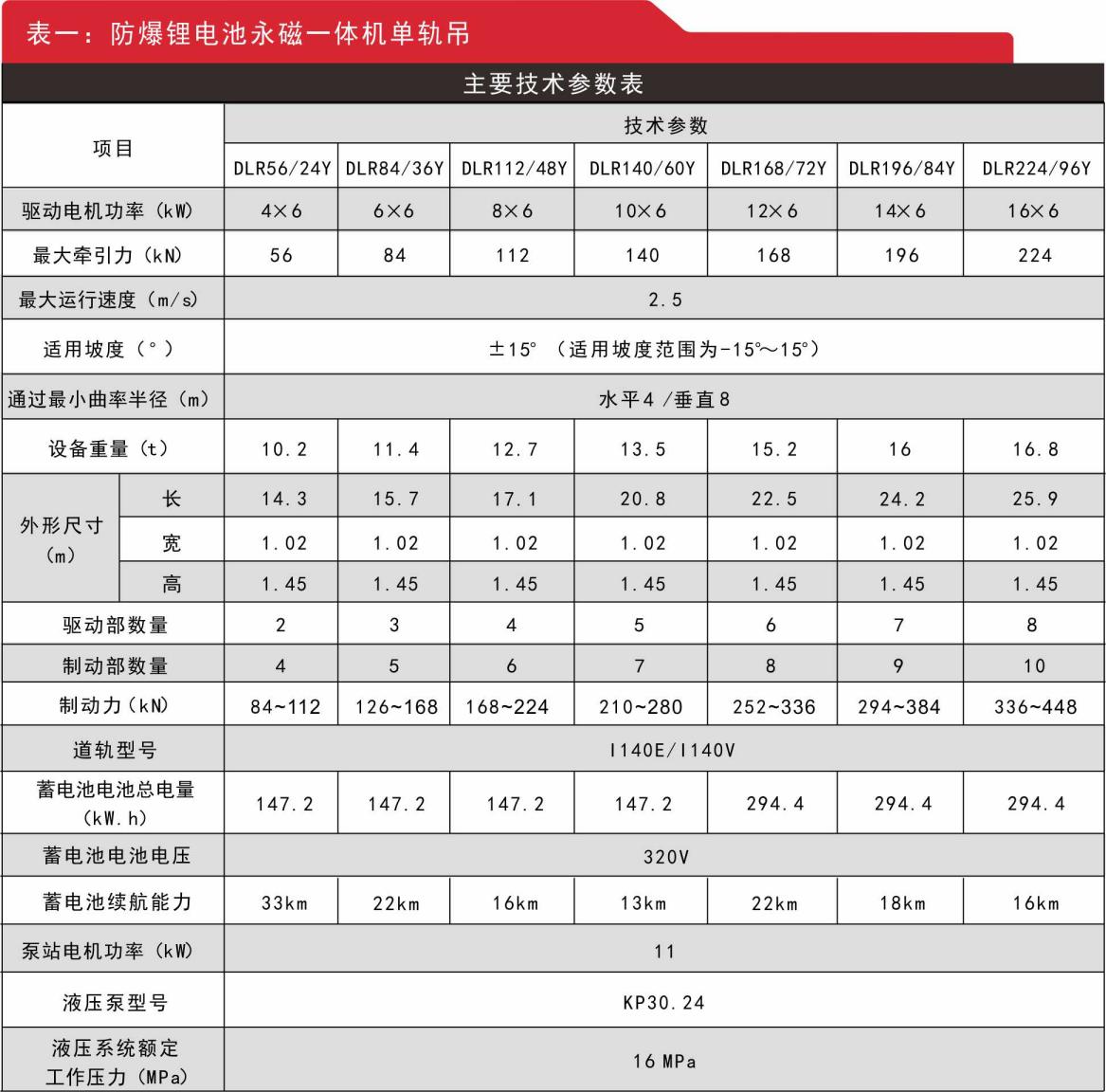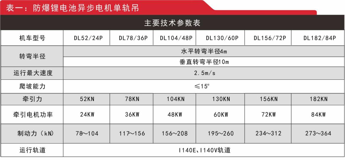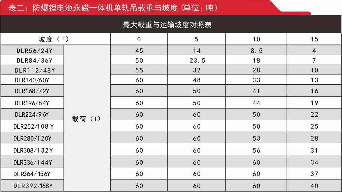 1.防爆鋰電池永磁一體機單軌吊參數(shù)及負載表