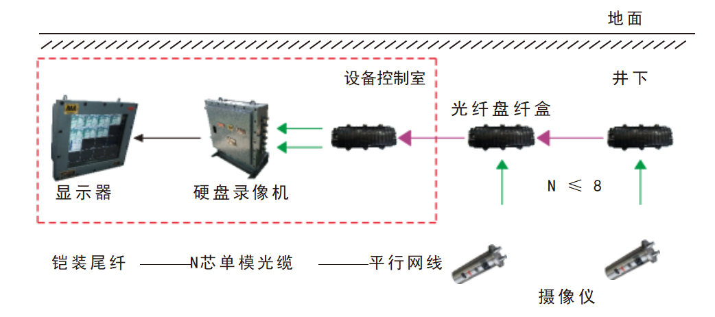 1、控制功能:在運(yùn)輸設(shè)備巷道的機(jī)頭、機(jī)尾等處各安裝1個(gè)(最多不超過(guò)8個(gè))光纖攝像儀,對(duì)監(jiān)控點(diǎn)的情況進(jìn)行實(shí)時(shí)監(jiān)視,硬盤(pán)錄像機(jī)通過(guò)光纖接收視頻信號(hào),通過(guò)顯示器進(jìn)行顯示和切 換,實(shí)現(xiàn)地面和井下視頻信號(hào)實(shí)時(shí)顯示和存儲(chǔ)的目的。