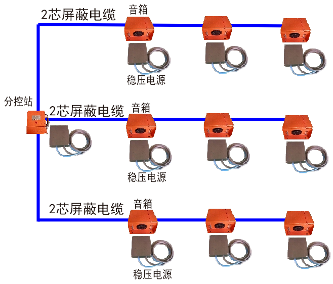 ◆ 音箱通過(guò)屏蔽電纜接入分站(允許多支路接入);