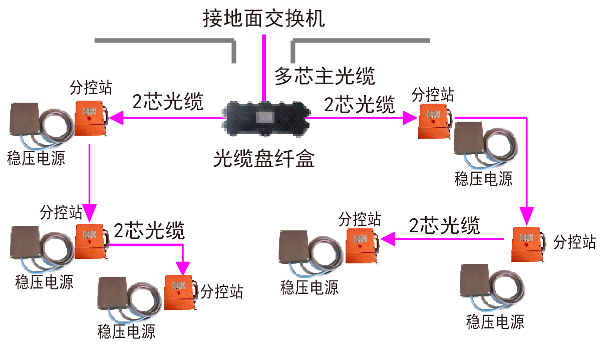 ◆ 多芯主光纜直接連接至地面交換機(jī),利用光纜盤(pán)纖盒分支連接至分站。