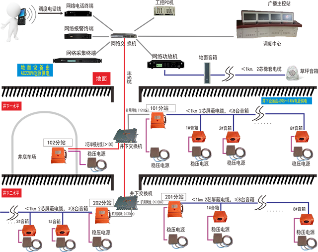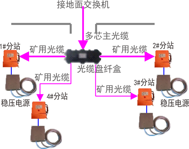 ◆ 地面至井下分站:采用礦用單模光纜最遠(yuǎn)傳輸距離為20km;