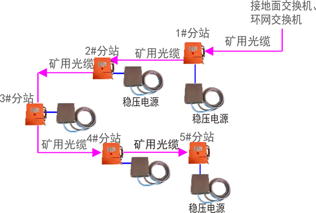◆ 此方式適用巷道分支較多、分站較多或井下無(wú)環(huán)網(wǎng)的情況。