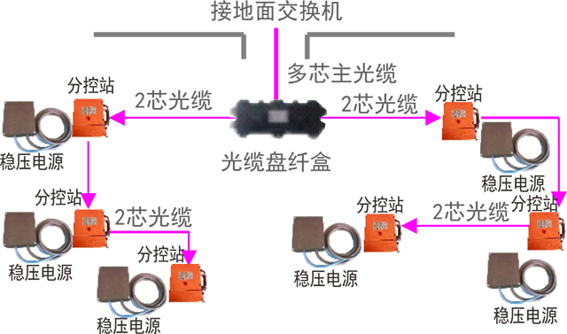 ◆ 多芯主光纜直接連接至地面交換機(jī),利用光纜盤(pán)纖 盒分支連接至分站。