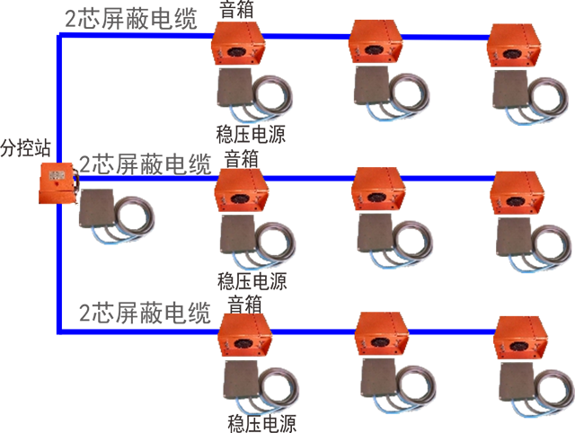 ◆ 音箱通過(guò)屏蔽電纜接入分站(允許多支路接入);