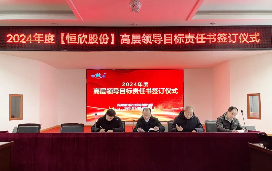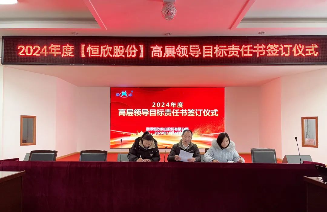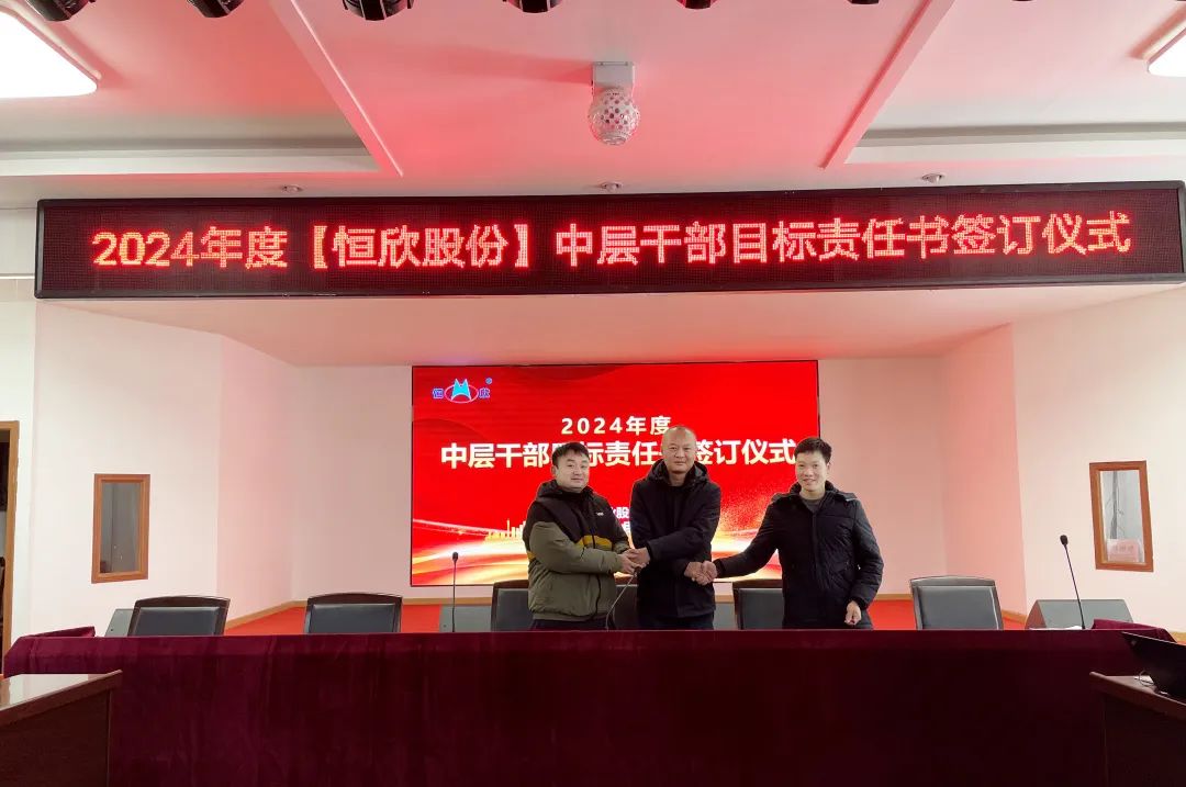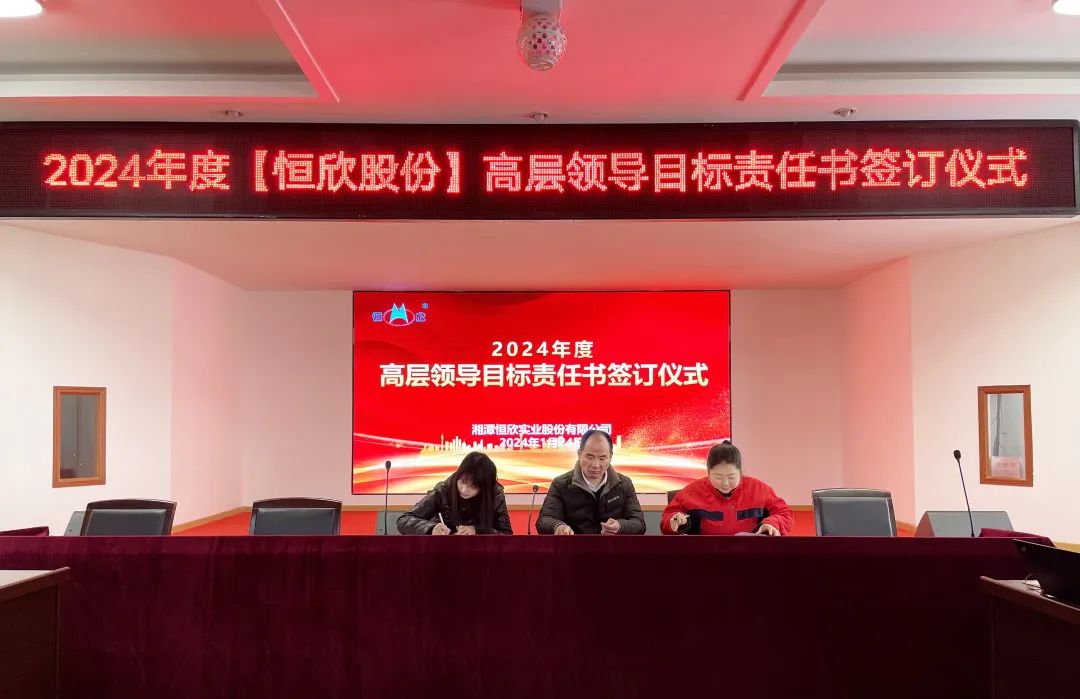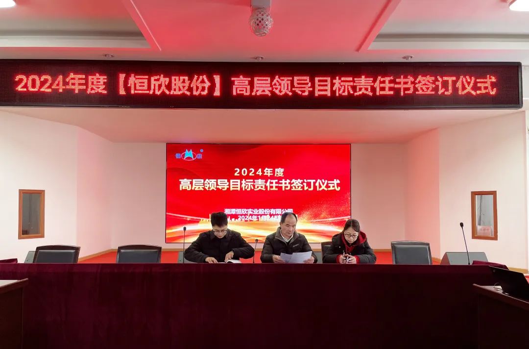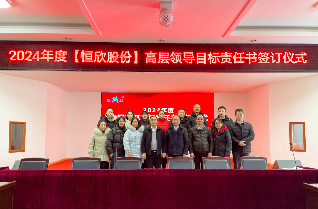 鳴鼓掛帥錨目標,滿弓勁發(fā)啟新程!1月24日下午,【恒欣股份】舉行2024年度目標責任書簽訂儀式。儀式由董事長肖公平主持,副董事長肖連平、總經(jīng)理肖龍武和全體高層領(lǐng)導、中層干部參加了簽訂儀式。