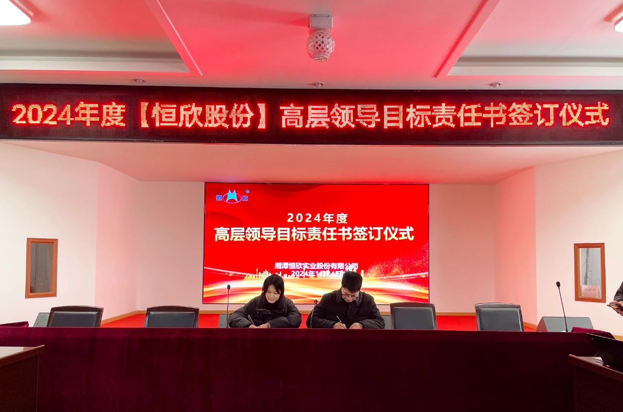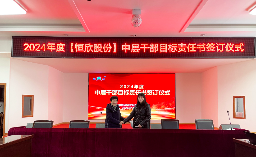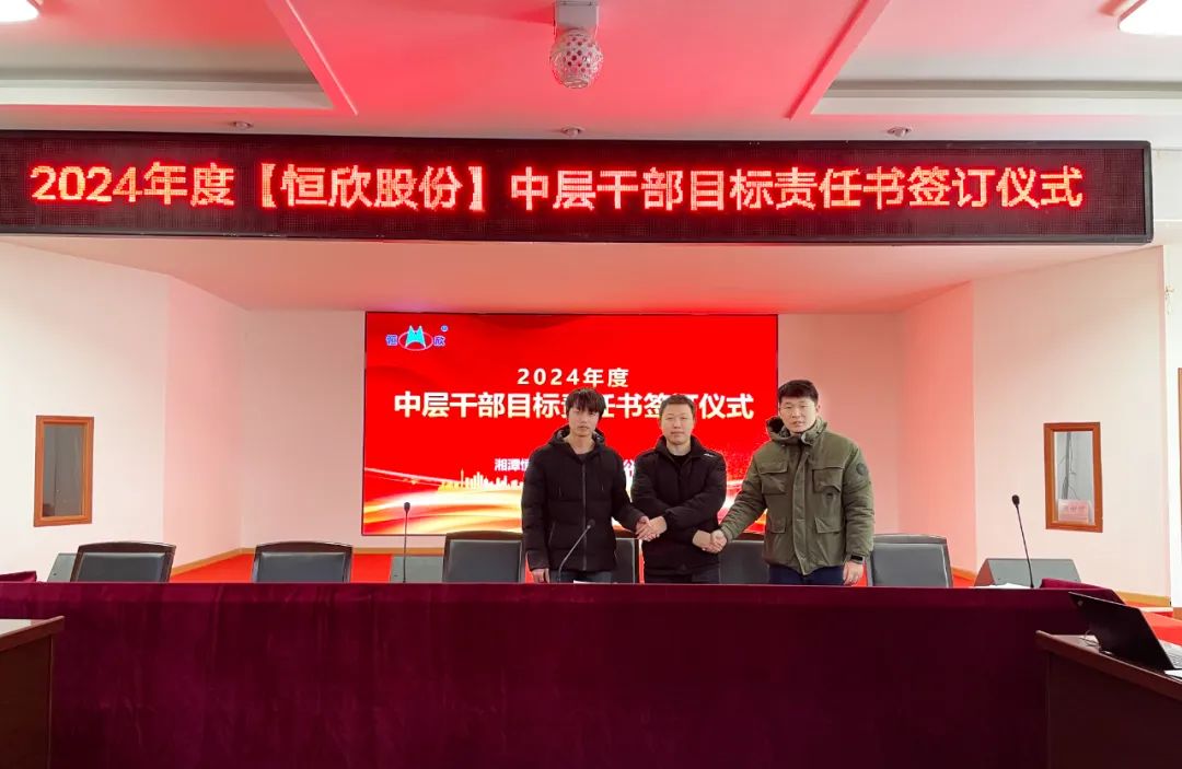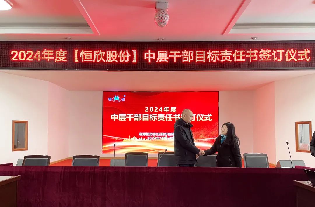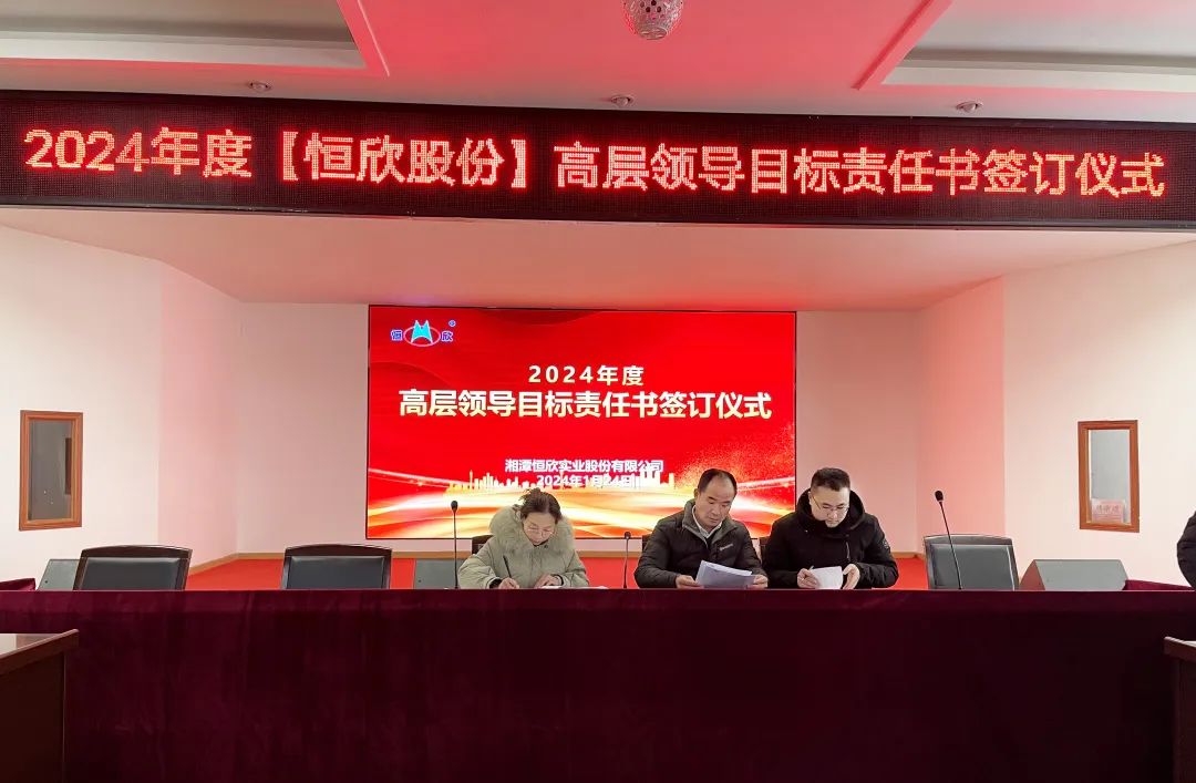 鳴鼓掛帥錨目標,滿弓勁發(fā)啟新程!1月24日下午,【恒欣股份】舉行2024年度目標責任書簽訂儀式。儀式由董事長肖公平主持,副董事長肖連平、總經(jīng)理肖龍武和全體高層領(lǐng)導、中層干部參加了簽訂儀式。