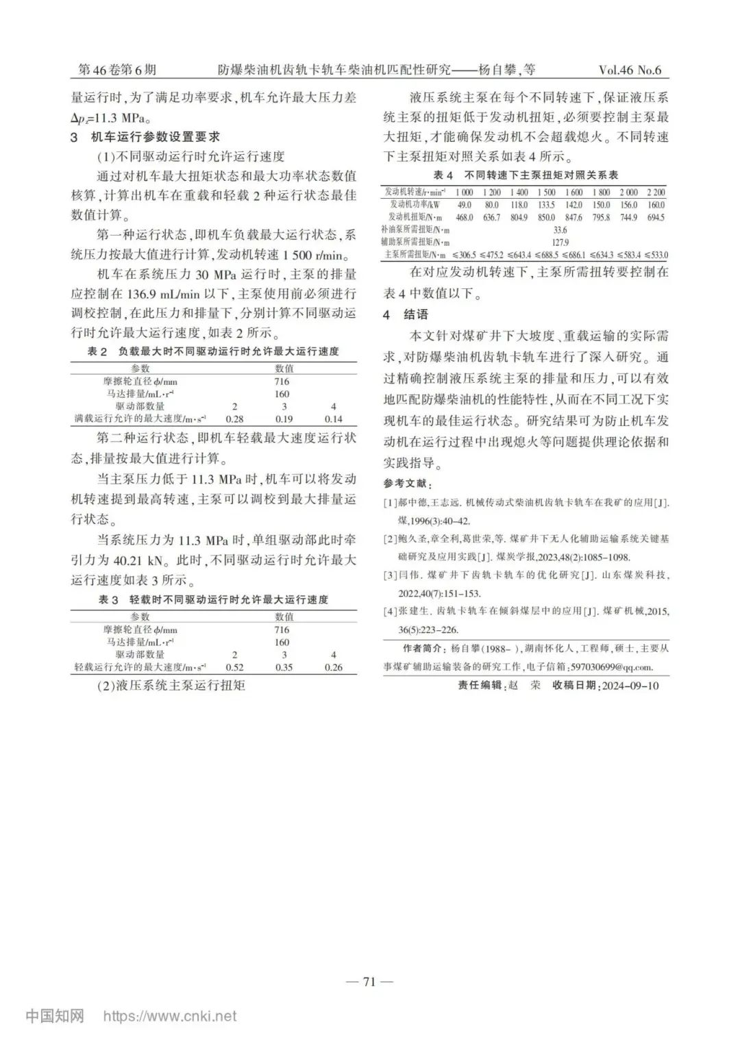 研究結(jié)果表明,通過控制不同機(jī)車型號的大負(fù)載運行速度及主泵的最大扭矩,能夠有效避免機(jī)車在運行過程中發(fā)生發(fā)動機(jī)熄火的情況。這項研究為防爆柴油機(jī)齒軌卡軌車的設(shè)計和應(yīng)用提供了理論依據(jù),同時為其在煤礦井下大坡度、重載運輸中的實際應(yīng)用提供了技術(shù)支持和指導(dǎo)。