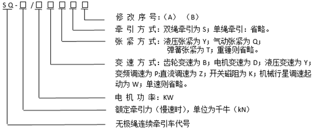 產(chǎn)品型號(hào)SQ-80/90B表示:額定牽引力為80KN、電機(jī)功率為90KW、齒輪變速、重錘張緊的無極繩連續(xù)牽
