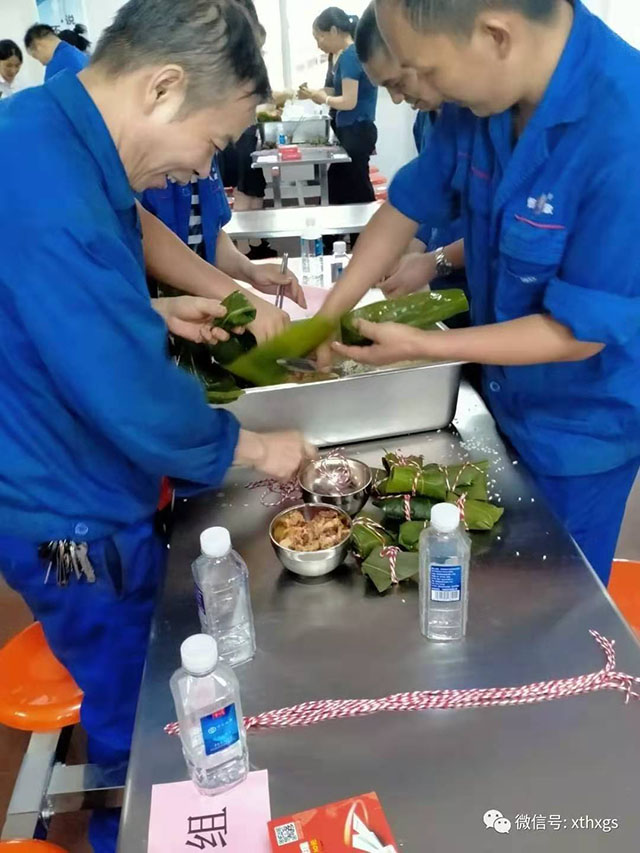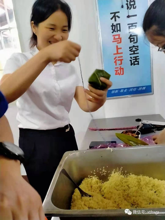 本次比賽共分為21組,每組4人,角逐"數(shù)量最多獎(jiǎng)”和“最美粽子獎(jiǎng)”。比賽前,進(jìn)行了關(guān)于端午節(jié)相關(guān)知識(shí)及【中國(guó)銀行】和【湘潭恒欣】企業(yè)文化知識(shí)搶答。隨著【中國(guó)銀行】周行長(zhǎng)吹響比賽口哨,活動(dòng)氣氛高漲,平時(shí)在車(chē)間搬鐵動(dòng)械、在家翹著二郎腿的大老爺們也開(kāi)始像模像樣地“捉粽子”了;上得廳堂、下得廚房的女士們輕松地包了一個(gè)又一個(gè)有棱有角粽子。雖然比賽只有十分鐘,但速度可不慢,最快的一組共包了40多個(gè)粽子哦?!鞠嫣逗阈馈客聜冋f(shuō)往年都是買(mǎi)粽子吃,今年可以吃到自己親手包的粽子,感覺(jué)特別好,特別幸福,印證了習(xí)大大的金句:“幸福是奮斗出來(lái)的”。
