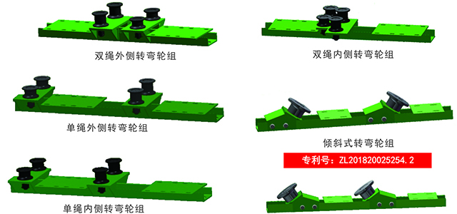 單繩內(nèi)側(cè)轉(zhuǎn)彎輪組和傾斜式轉(zhuǎn)彎輪組。