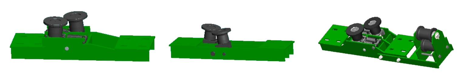 由于巷道條件復(fù)雜,線路中會(huì)出現(xiàn)變坡,鋼絲繩在往復(fù)運(yùn)轉(zhuǎn)的過程中會(huì)出現(xiàn)懸空或者脫離運(yùn)輸軌道的現(xiàn)象,因此需要使用壓繩輪組對(duì)鋼絲繩定位,